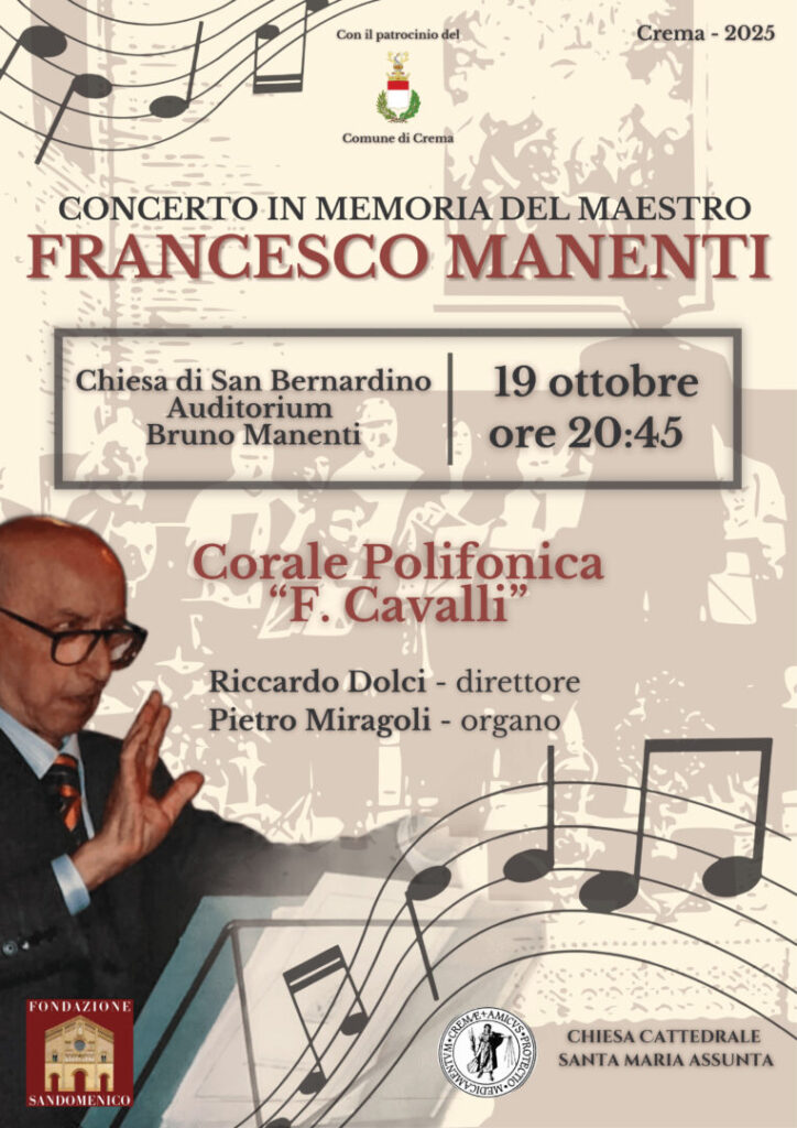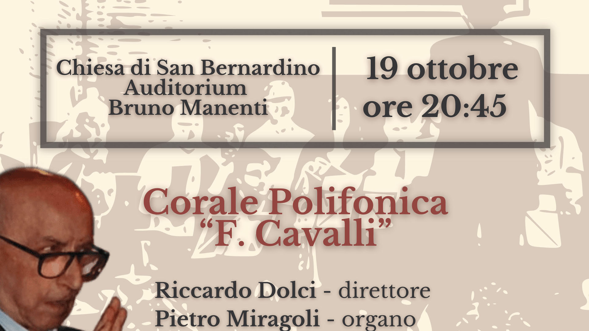 Si terrà il 19 ottobre alle ore 20,45 presso la Chiesa di San Bernardino-Auditorium “Bruno Manenti”, il concerto in memoria del Maestro Francesco Manenti. La Corale Polifonica “Francesco Cavalli”, diretta dal Maestro Riccardo Dolci, sarà la protagonista di questa performance, che vedrà Pietro Miragoli all’organo.