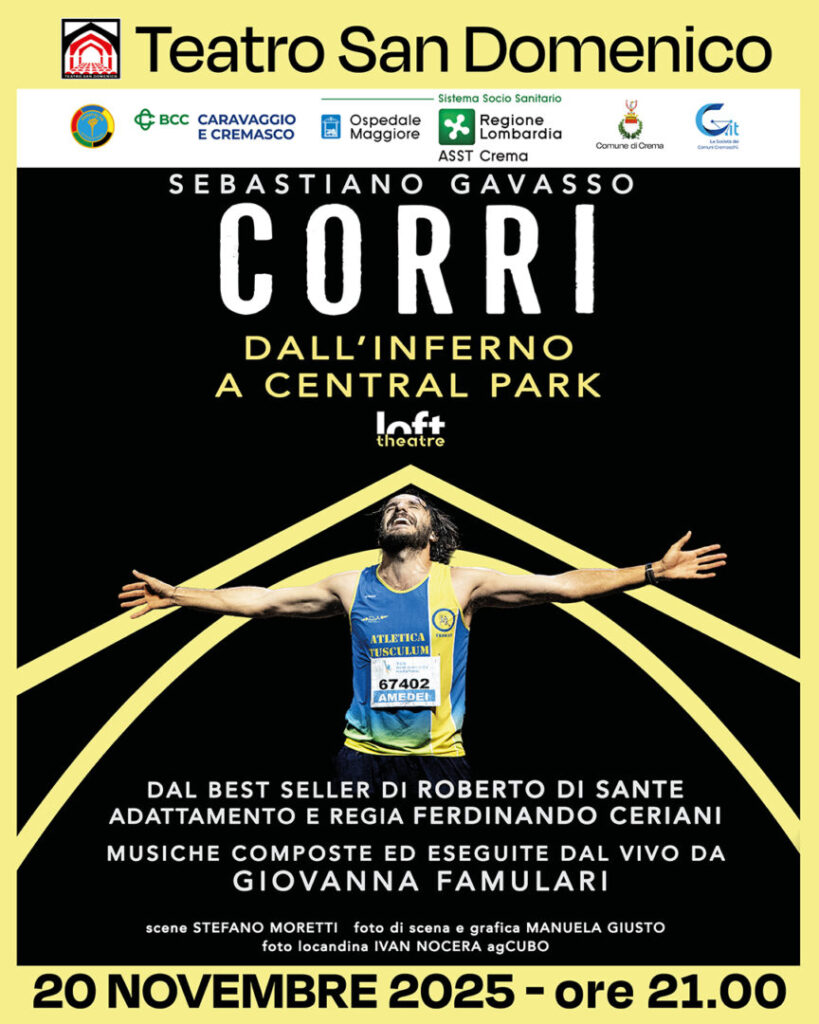 Tratto dall’omonimo best seller di Roberto di Sante, prodotto da Loft Theatre, con la regia e l’adattamento di Ferdinando Ceriani, CORRI vede sul palco uno straordinario Sebastiano Gavasso – attore e runner nella vita – accompagnato dalle musiche dal vivo della violoncellista di fama internazionale Giovanna Famulari.