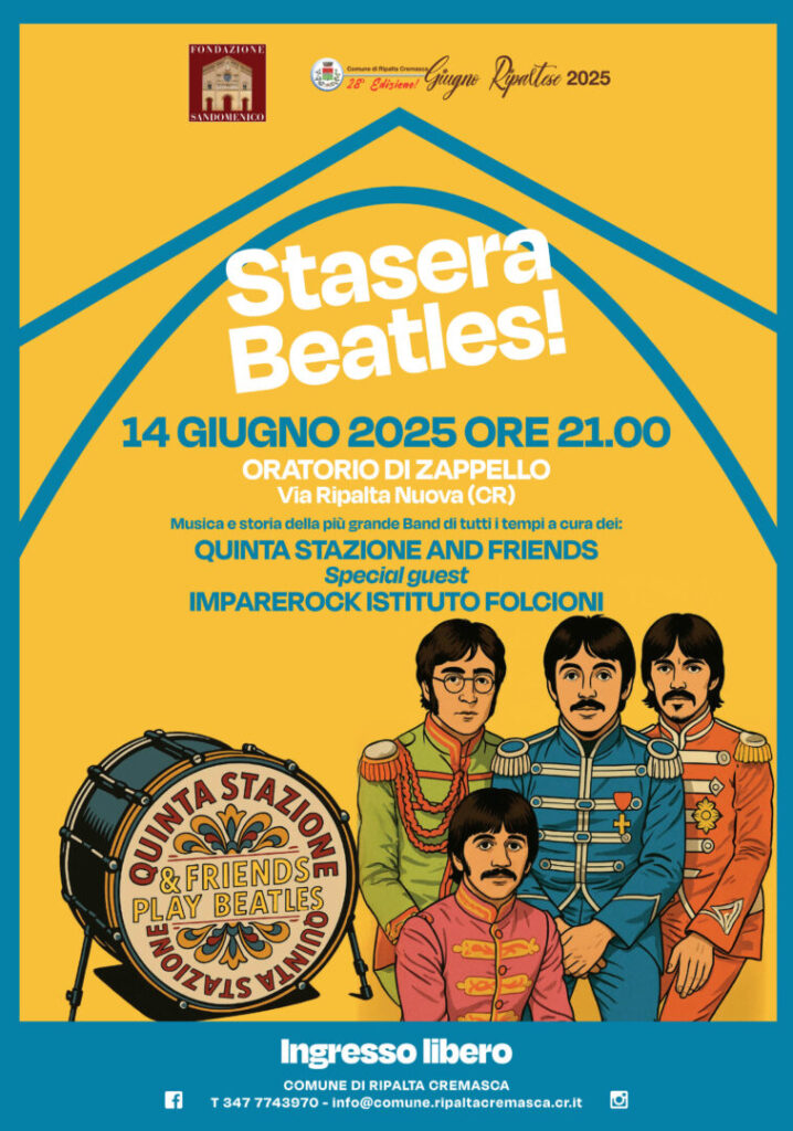 Il primo capitolo dei Beatles Days si svolgerà il 14 giugno alle ore 21,00 presso l’oratorio di Zappello in occasione della rassegna “Giugno Ripaltese” organizzata dal Comune di Ripalta Cremasca in sinergia con la Fondazione San Domenico.