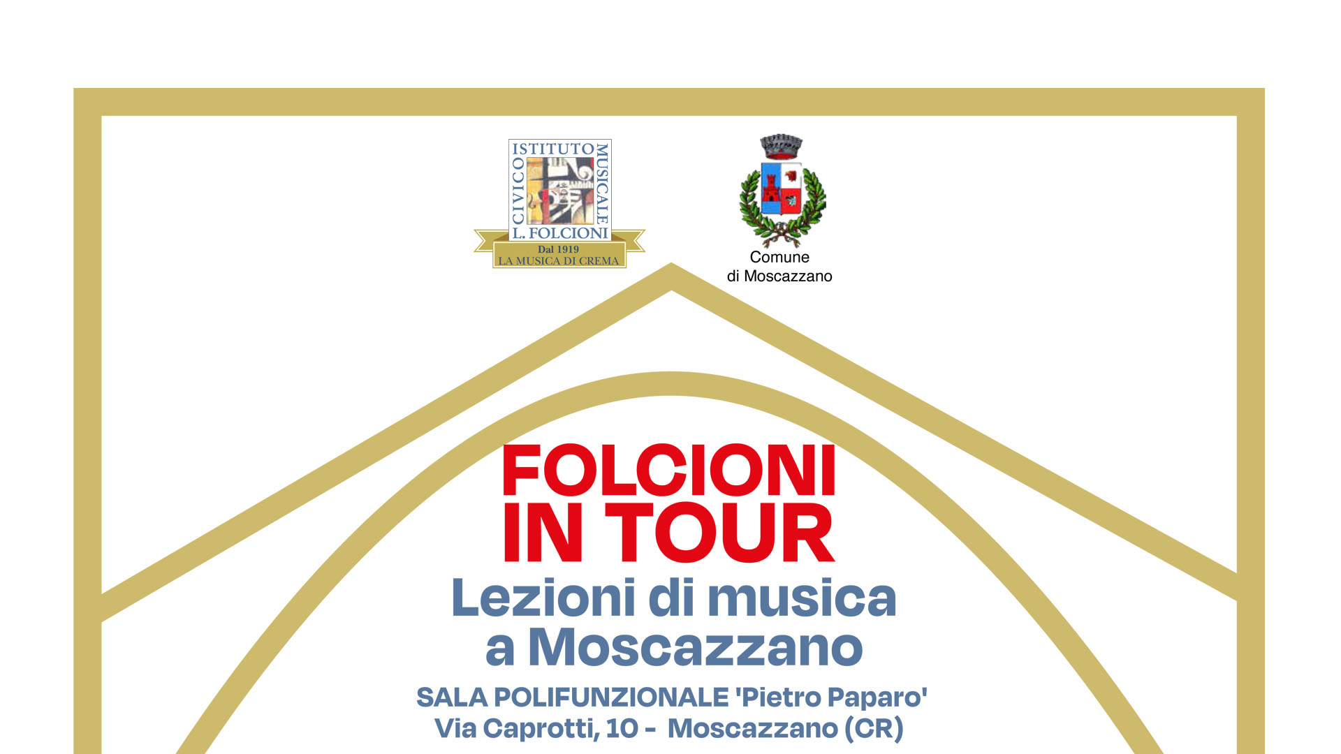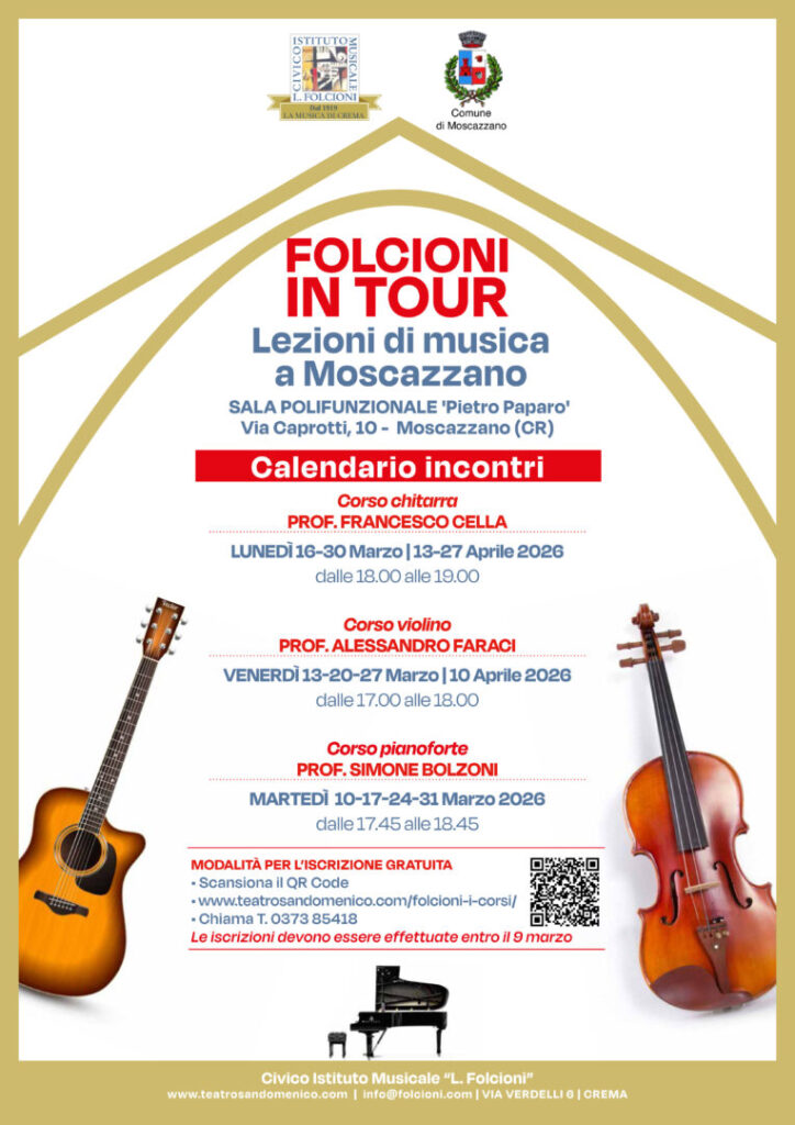 Grazie alla collaborazione tra la Fondazione San Domenico ed il Comune di Moscazzano, entrato a far parte dei Soci Partecipanti Sostenitori a fine giugno 2025, dal mese di marzo saranno attivate alcune lezioni gratuite di chitarra, violino e pianoforte presso la sala polifunzionale “Pietro Paparo” a Moscazzano.
