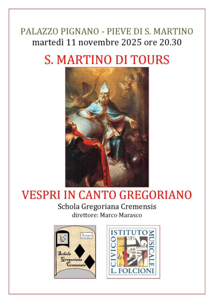 Martedì 11 novembre alle ore 20,30 presso la Pieve di San Martino a Palazzo Pignano, si terranno i vespri in canto gregoriano a cura della Schola Gregoriana Cremensis, diretta dal Maestro Marco Marasco.
